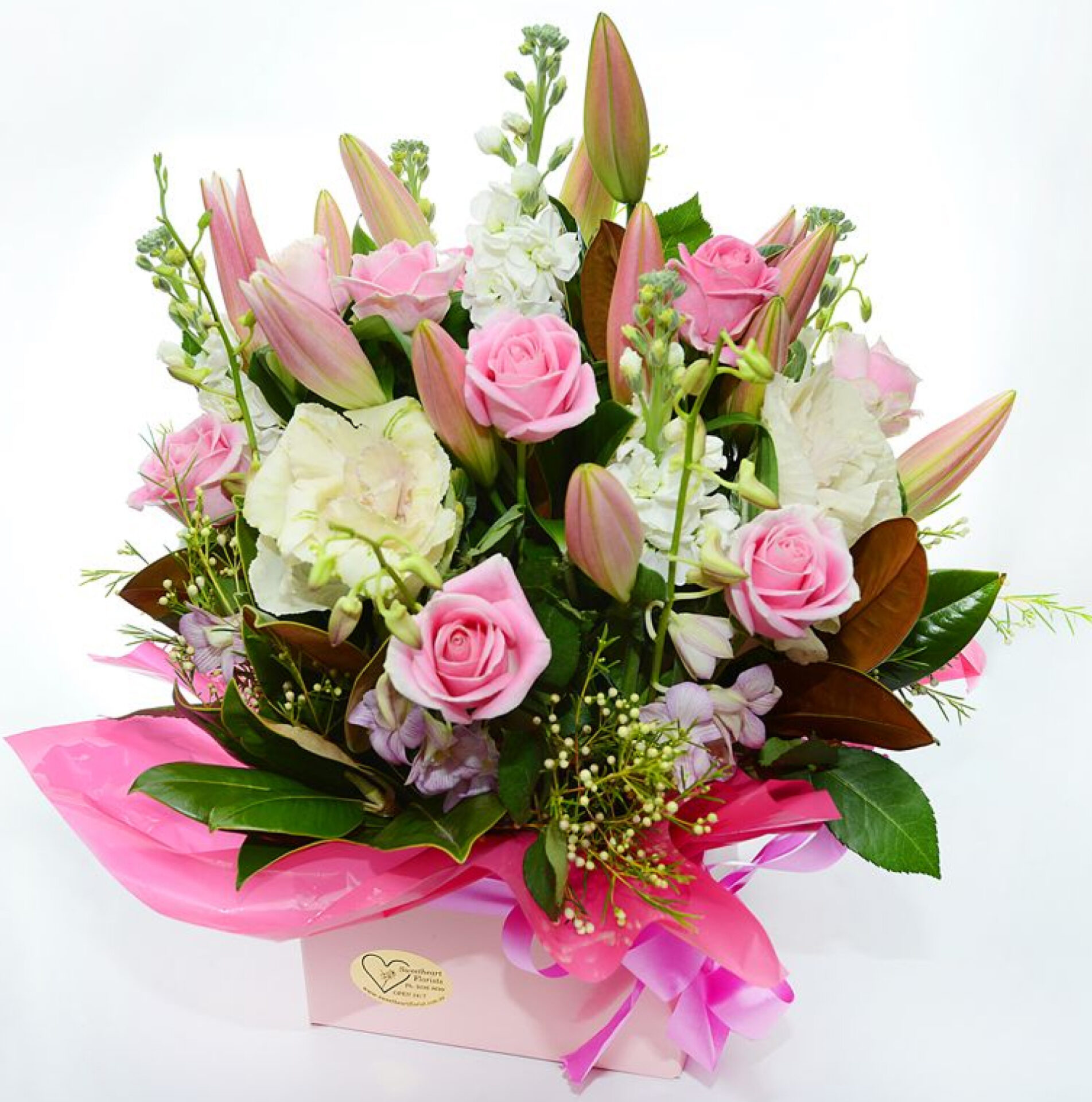 An elegant box arrangement of pink lilies, pink roses mixed with seasonal white and purple flowers, please note flowers are seasonal and may vary subject to availability.