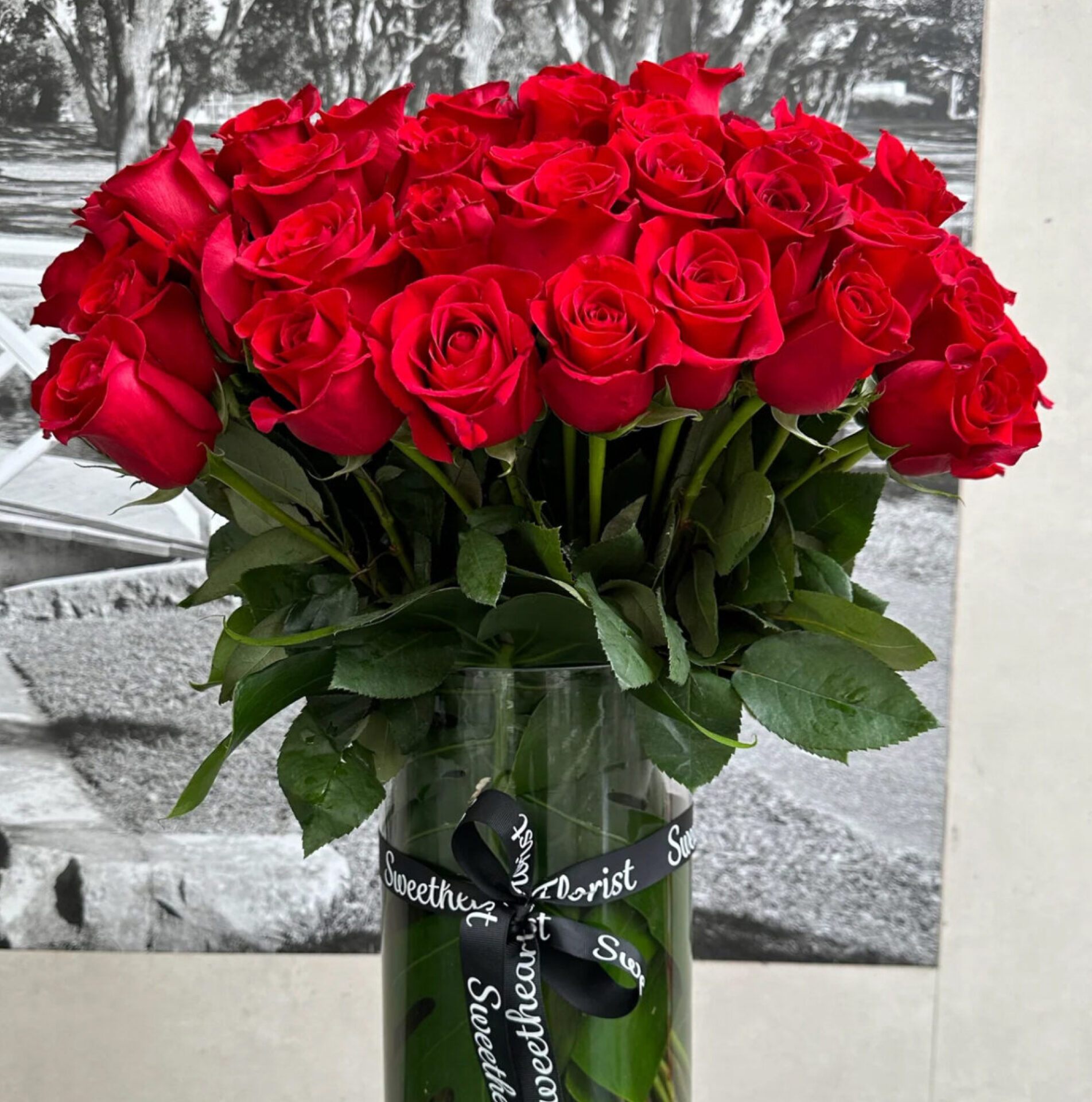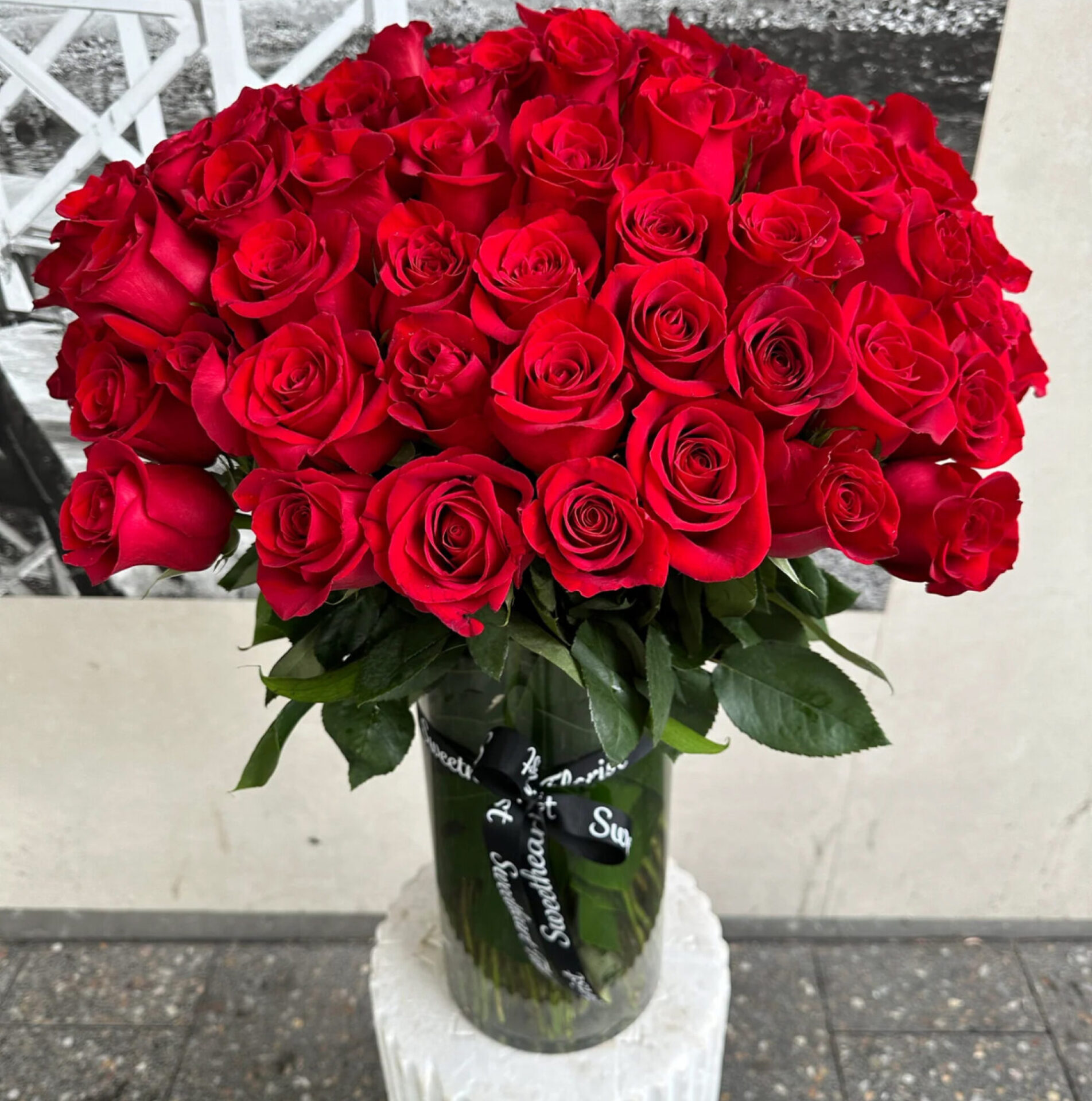 100 gorgeous Red Roses presented in a clear glass vase, the real way to make a lasting impression for a range of occasions including love, romance, anniversary and wedding day flowers.